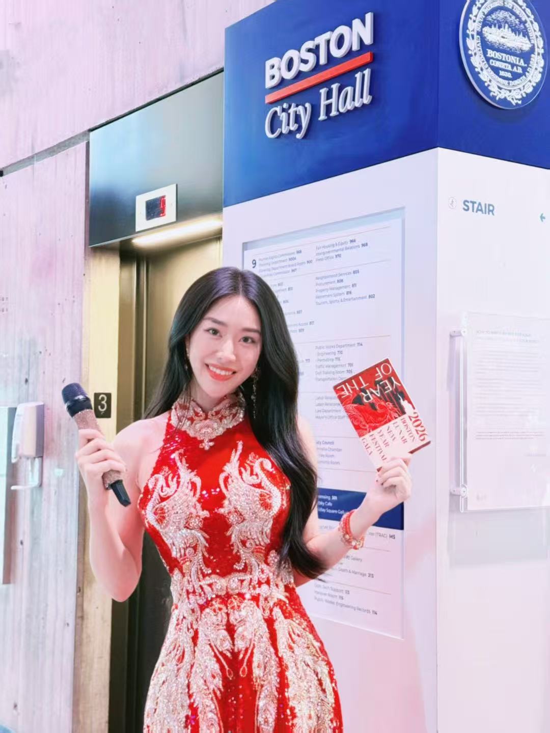 2026年农历新年,她身着一袭金龙刺绣红色旗袍,在波士顿市政厅(Boston City Hall)主持新春文化活动,手持话筒的那刻,既是华人文化的讲述者,也是东西方对话的一道桥梁。