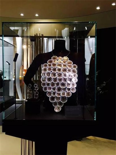 当然,在展馆中出现的基本都是百万人民币起跳的收藏级珠宝,其中可以称为“镇馆之宝”的作品,是一套价值在千万以上的金色异形珠项链和耳环,单是收集其这些大小均等,色泽一致的珍珠,便花费了两年的时间。