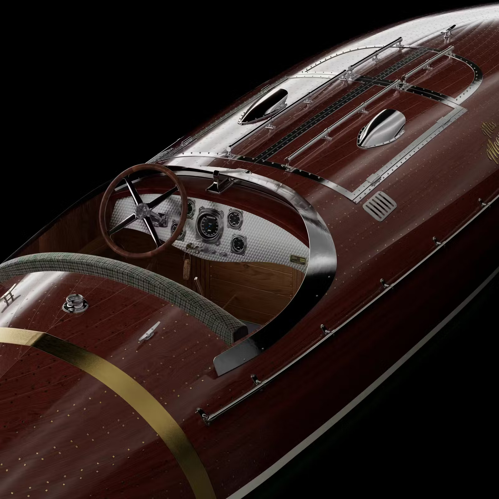 Huntsman 与来自明尼苏达州的船厂 Fitzke Boatworks 联手,打造了一艘“绅士快艇”—— Miss Moonshine 。这是一艘满载 20 世纪早期赛车风格的高速动力艇,采用定制粗花呢装饰。船长 23 英尺,采用桃花心木和西班牙雪松木打造,搭载手工制作的 5.7 升 V8 发动机,伴随坚韧的航海级粗花呢面料,足以抵御海浪。Fitzke 甚至还找到老式缝纫机来缝制内饰,只为达到与 20 世纪 20 年代原版船艇相同的工艺水平。