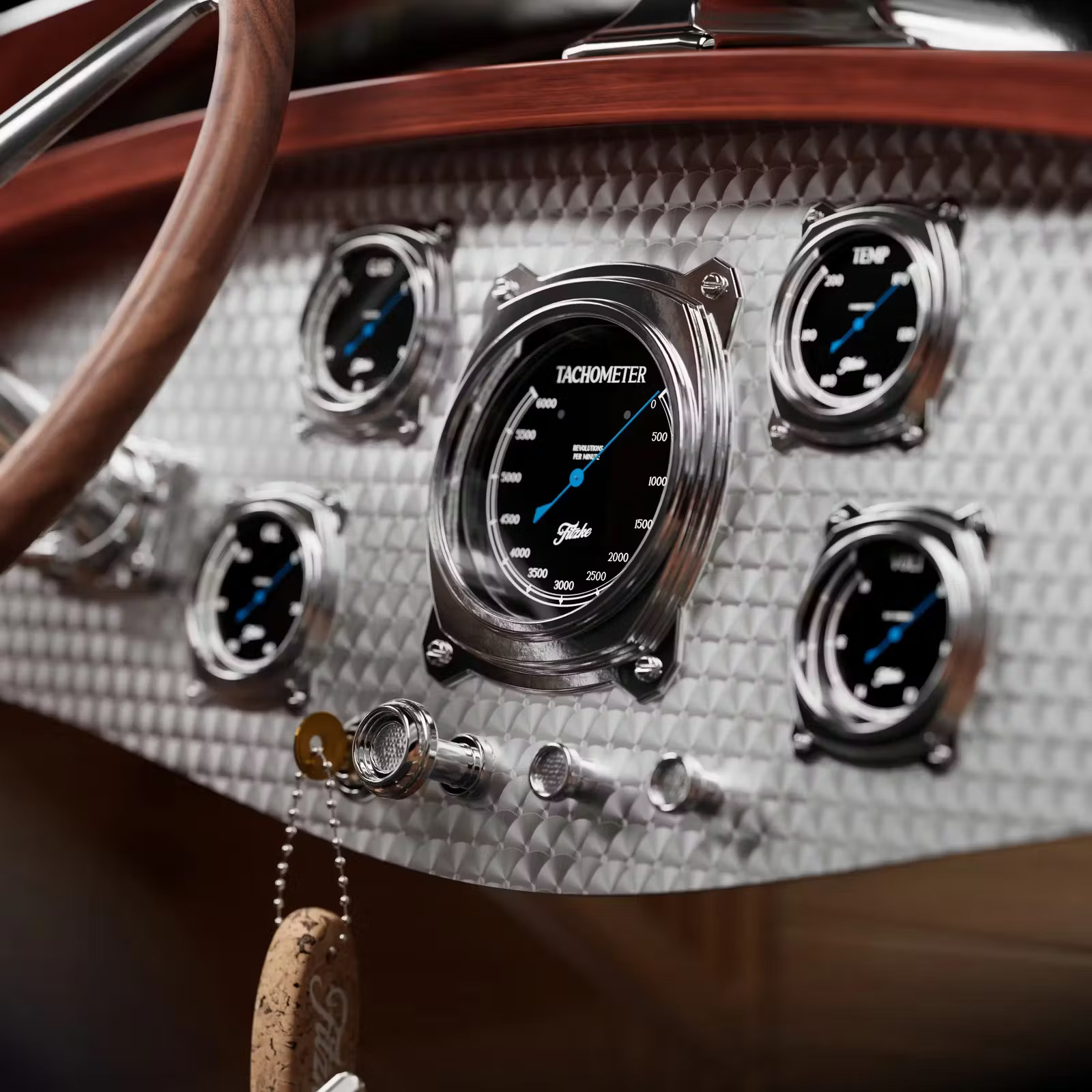 从车削铝制仪表板到粗花呢包裹的挡泥板,这艘快艇的剪裁工艺堪比萨维尔街的任何剪裁典范,而这种执着正是 Huntsman 的传承。近两个世纪以来,Huntsman 在定制领域锋芒毕露,其西装包含 28 个独立尺寸,从零开始绘制纸样,一件西装夹克的手工工序长达 80 小时。在萨维尔街,这种精准度在意料之中,但场景若是换到水上,大概率我们不会找到多少艘用如此精细布料剪裁的船只。Miss Moonshine 犹如身披三件套绅士赛车服,证明了定制文化也可以装点波光粼粼的生活方式。